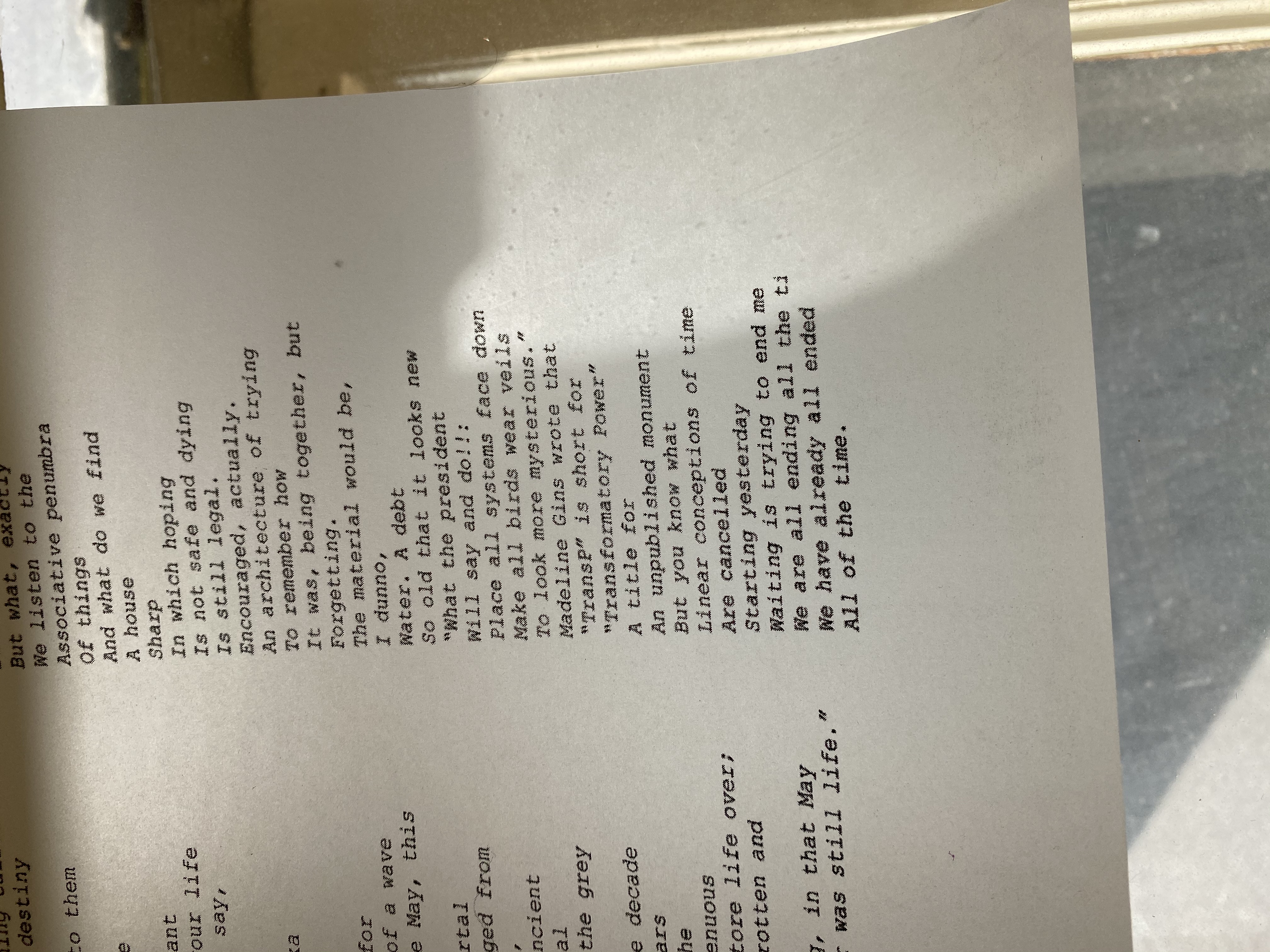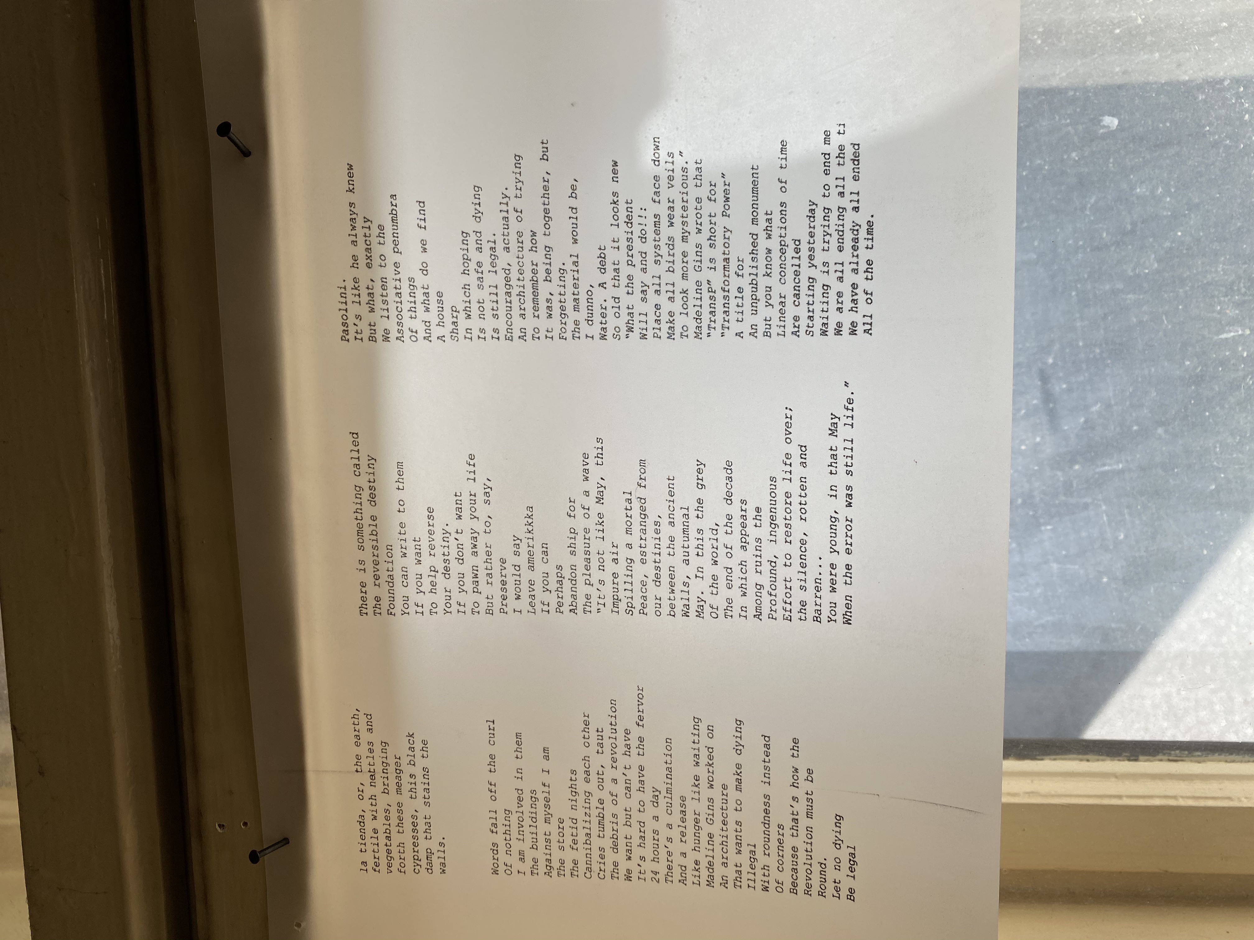 When yaby invited me to participate in a group show titled “pen pressure: a show of poetry, fantasy, and faith” for Haus, I (like many) was not leaving my own house much, it being early in the pandemic. I shuffled between house and store,store and house. While writing the poem “la tienda, or, the earth,” I was circling around these situational loci. Going to the store (la tienda), reading a Pasolini poem, watching a film. Repeat. A few months prior, Siglio Press had published The Saddest Thing Is That I Have Had to Use Words: A Madeline Gins Reader, edited by Lucy Ives. This text became another anchor.