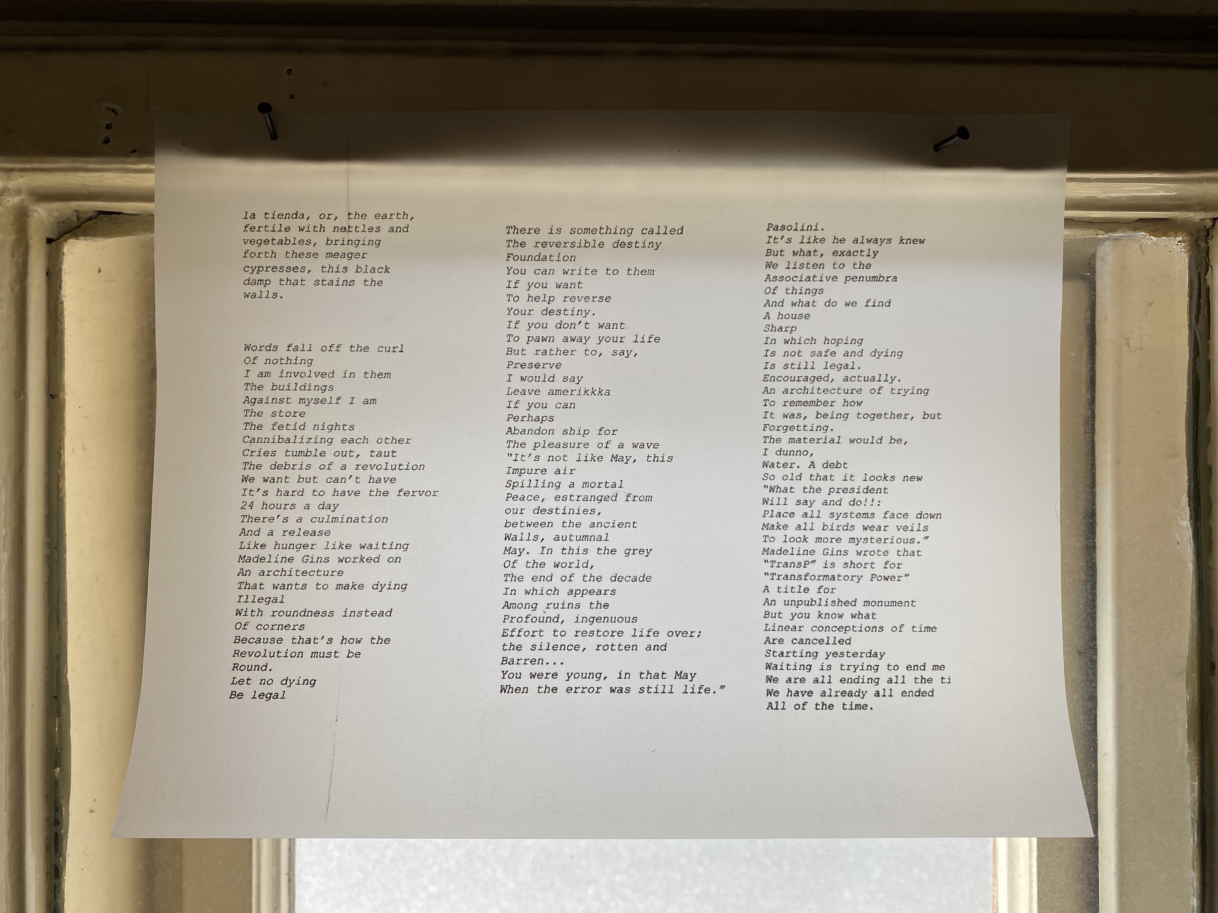 In the room, the light filters through the poem, diffuse. Rusty nails secure it to the decrepit molding. Decay continues.